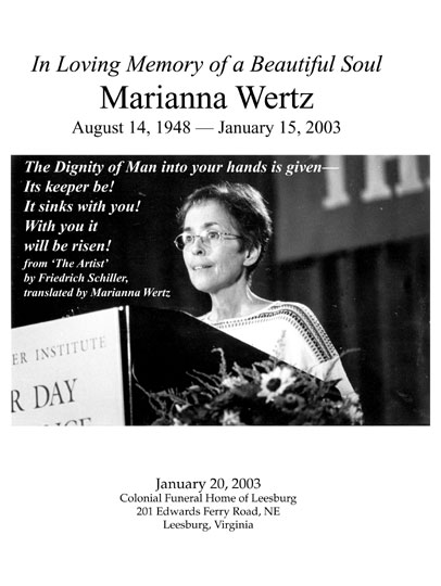 As difficult as it is to do, I want to provide a record of Marianna's beautifully sublime funeral service. The program was a simple 8 1/2 by 11 folded sheet prepared by Effie DeGroot and Janice Chaitkin. It featured a photo of Marianna from the September 2002 Schiller Institute Conference, during which she introduced Amelia by reporting on the Selma, Alabama ceremony honoring Amelia, which Marianna had the honor of attending and addressing. The Program Cover: