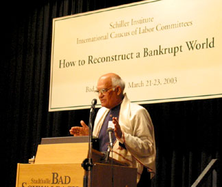 Since yesterday, many heartbreaking statements have been made, and I am sure that today and tomorrow, more ideas will emerge, because this gathering, in my opinion, is here to consider, in a new emerging world situation, what kind of world we are going to build. Yesterday Mr. LaRouche gave a very detailed kind of road map of tomorrow's world. And today, Helga [Zepp-LaRouche] gave us a very thoughtful and very educative historical development of the forces. We have to learn some lessons from the events of history. Unless and until we learn proper lessons, draw proper conclusions, and also work out our proper strategy for today, the alternative strategy is a doomed world and a doomed humanity. Science and technology, on the one hand, provided all the necessary facilities for life; they have made our life very much easier, though it is not for the entire population, it is for a few privileged sections of the society. But on the whole, if you see, the progress of science and technology has turned its service to humanity. But we should not forget at the same time, that they have also given us the potentiality to destroy the whole world. And today the world has got so much nuclear armaments, that they can destroy the entire world not once and twice, nor a dozen times, but they can destroy this world a thousand times. So we are at a crossroad, humanity is today at the crossroad. Mahatma Gandhi's LeadershipAnd therefore we are here; and perhaps this Iraq crisis has provided us an opportunity to give a very serious thought. Before I make some observations about ... how can India play a role in Eurasian cooperation, in cooperation with Europe and Asia, Africathe whole worldI would like to read a statement of Mahatma Gandhi, and I would like our young friends here to know, that Mahatma Gandhi, before he started leading our freedom struggle in India, he started raising his voice against this racist regime in South Africa. When he wenthe was visiting South Africa when still very young, and like you; and he saw how the racist regime was bringing oppression against the natives of Africa, how they were denying them the fundamental human rightshe raised his voice there; he started the beginning of his freedom struggle in South Africa. And 20 years later he came to India and then he made it a mass movement. How did he do that? He did it being with the people, seeking the cooperation of the people, doing certain things on the basis of some idealism. He was a man with idealism. He was a man who has immense faith in non-violence, immense faith in truth, immense faith in justice. And therefore with the conviction, with the faith, he started the movement in a peaceful manner. And when we were in our freedom struggle in India, our young people sometimes were losing patience, wanting truly to take arms in their hands, wanting to organize guerrilla warfare against the British rulers. Gandhi said: "No, you cannot defeat violence with violence; you may achieve perhaps some result, but it will not be lasting. Don't do that! Fight on the basis of your ideals." And when there was some kind of upsurgebloodshed, at one time there washe said, "No, I cannot tolerate violence." And he was educating our people, that the freedom struggle is not against the British people, it is against the imperialism. It is not a question of white and black.... So, I want to drive your attention to what he said six decades before. How would he look at the world, what we are discussing? He spoke about the world of tomorrow. A small quotation of what he said, I would like to read to you. I am not reading the whole thing. He said about the world of tomorrow: "Perhaps never before has there been so much speculation about the future as there is today." (The same speculation about our future is today. This he said six decades before.) "Will our world always be one of violence? Will there always be poverty, starvation, misery? Will we have a firmer and wider belief in religion, or will the world be godless? If there is to be a great change in society, how will that change be wrought? By war, or revolution? Or will it come peacefully? "Different men give different answers to these questions, each man drawing the plan of tomorrow's world as he hopes and wishes it to be. I answer not only out of belief, but out of conviction. The world of tomorrow will be, must be, a society based on non-violence. That is the first law: Out of it all other blessings will flow. It may seem a distant goal, an impractical Utopia. But it is not in the least unobtainable, since it can be worked for here and now. An individual can adopt the way of life of the futurethe non-violent waywithout having to wait for others to do so. And if an individual can do it, cannot whole groups of individuals? Whole nations?" Then he said, and I will underline it: "Men often hesitate to make a beginning, because they feel that the objective cannot be achieved in its entirety. This attitude of mind is precisely our greatest obstacle." Nothing is impossible, but if in our mind we have doubts, we have hesitation, we do not have the capacity to take a decision. Then the real trouble starts. "This attitude of mind is precisely our greatest obstacle to progressan obstacle that each man, if he only wills it, can clear away." So, this is a small quotation, which I have read from his idea of the world of tomorrow. War on Iraq and the UNSo I am saying, today the world is facing the real crisis. Nobody could imagine this. As I said yesterday, the 21th Century is going to be a century of such a great challenge. We will be confronted with the annihilation of society, annihilation of certain values. Today it is not the question, that Mr. Bush and Mr. Blair jointly have attacked Iraq. The question is: They have attacked the United Nations Security Councilan institution, world-institution, which came into existence after such great sacrifices were made, wars were fought. After that, that institution came 