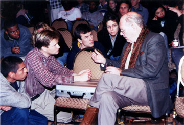 Lyndon LaRouche talks with youth organizers during the 2003 Presidents Day ICLC/Schiller Conference
