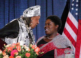 Amelia Boyton Robinson is greeted by LaRouche Youth Movement organizer Erin Smith.