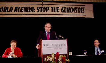 Approximately 900 people gathered in both locations, under the banner "A New World Agenda: Stop the Genocide." That new world agenda had been elaborated by LaRouche in a series of discussion documents going into the conference. These began with his Nov. "The Follies of the Economic Hit Men: Re-animating the World's Economy" and continued with "Toward a Second Treaty of Westphalia: The Coming Eurasian World" and "The Dialogue of Civilizations: Earth's Next Fifty Years". On the eve of the conference, LaRouche issued two more discussion documents "The Global Option for this Emergency: Beyond Westphalia Now," and "Franklin Roosevelt's Miracle."