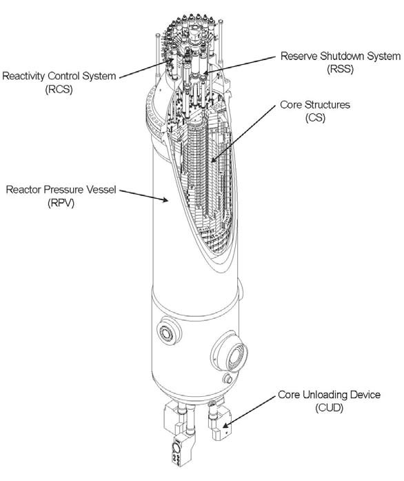 The PBMR is a helium-cooled, graphite-moderated, High-Temperature Reactor (HTR). It has a 27 m (88 ft) high vertical steel Reactor Pressure Vessel (RPV) with an inner diameter of about 6.2 m (20 ft). The RPV contains and supports a metallic core barrel. The core barrel, in turn, supports the annular pebble fuel core, which is located in the space between a central and outer graphite reflector. Vertical borings in these reflectors are provided for the reactivity control elements.