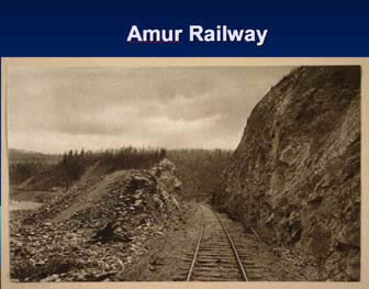 The railway was built in three stages. On the lower part of the graphic, you can see the first stage marked in red, the second stage in yellow, and the third one in green. You see that, in fact, the railroad was started from the two ends: from Vladivostok northward, and from Chelyabinsk eastward. And you see that the most difficult parts of the railway, the green areas, around Khabarovsk and what we call Circum-Baikal Railroad, were left for the future, because these areas here are very difficult to build in. There are mountains, large rocks, landslides, as we shall see later.