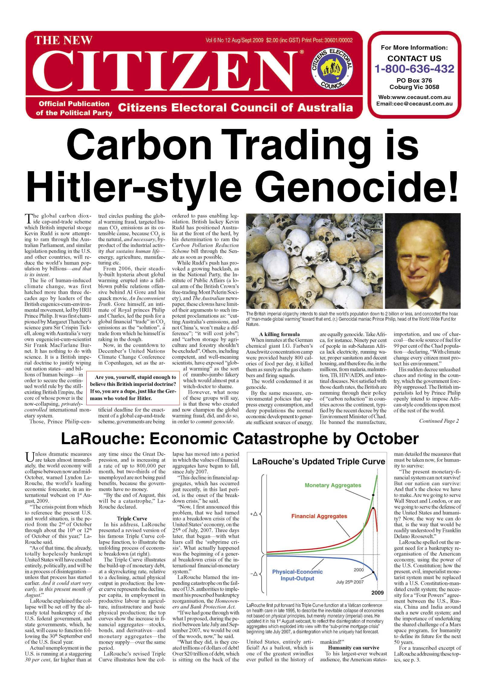 A special issue of the New Citizen, published in 2011, went after the core of British imperial policy—Green Fascism (Figure 12). We documented that the worldwide green fascist movement was hatched by the British Crown’s Privy Council following World War II, out of the British Eugenics Society. Queen Elizabeth’s immediate family took a leading role, beginning with her husband Prince Philip, co-founder of the family’s population-reduction charity, the World Wildlife Fund (WWF).