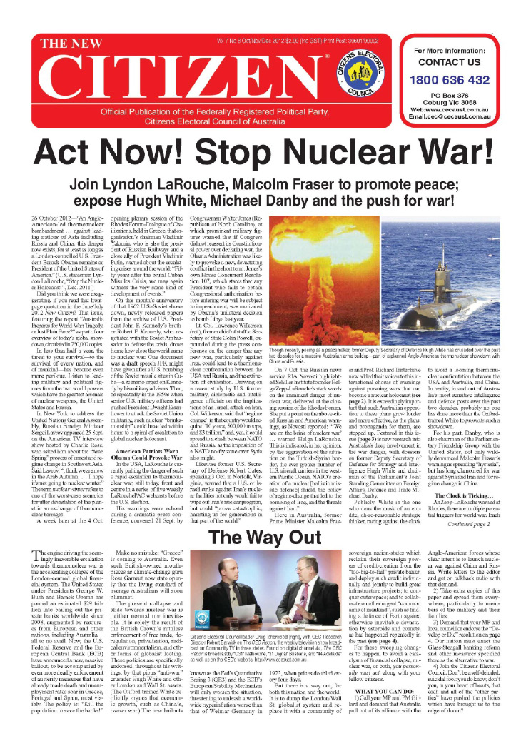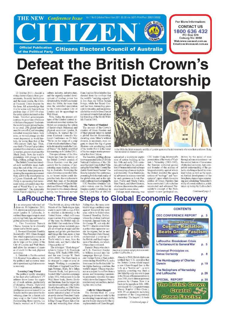 I would like to present to you the strategic vision of the Citizens Electoral Council of Australia, which is the LaRouche movement in our nation. Our vision is one of vast, physical-economic development, premised upon national banking and a public credit system. We intend to play our part internationally to defeat the genocide policies and war threats coming from the financial oligarchy, which Australians for over a century have called “the Money Power.” That financial oligarchy is based in the City of London and centered on the British Crown—and the wearer of that crown, the Queen of England, happens to be our official head of state.
