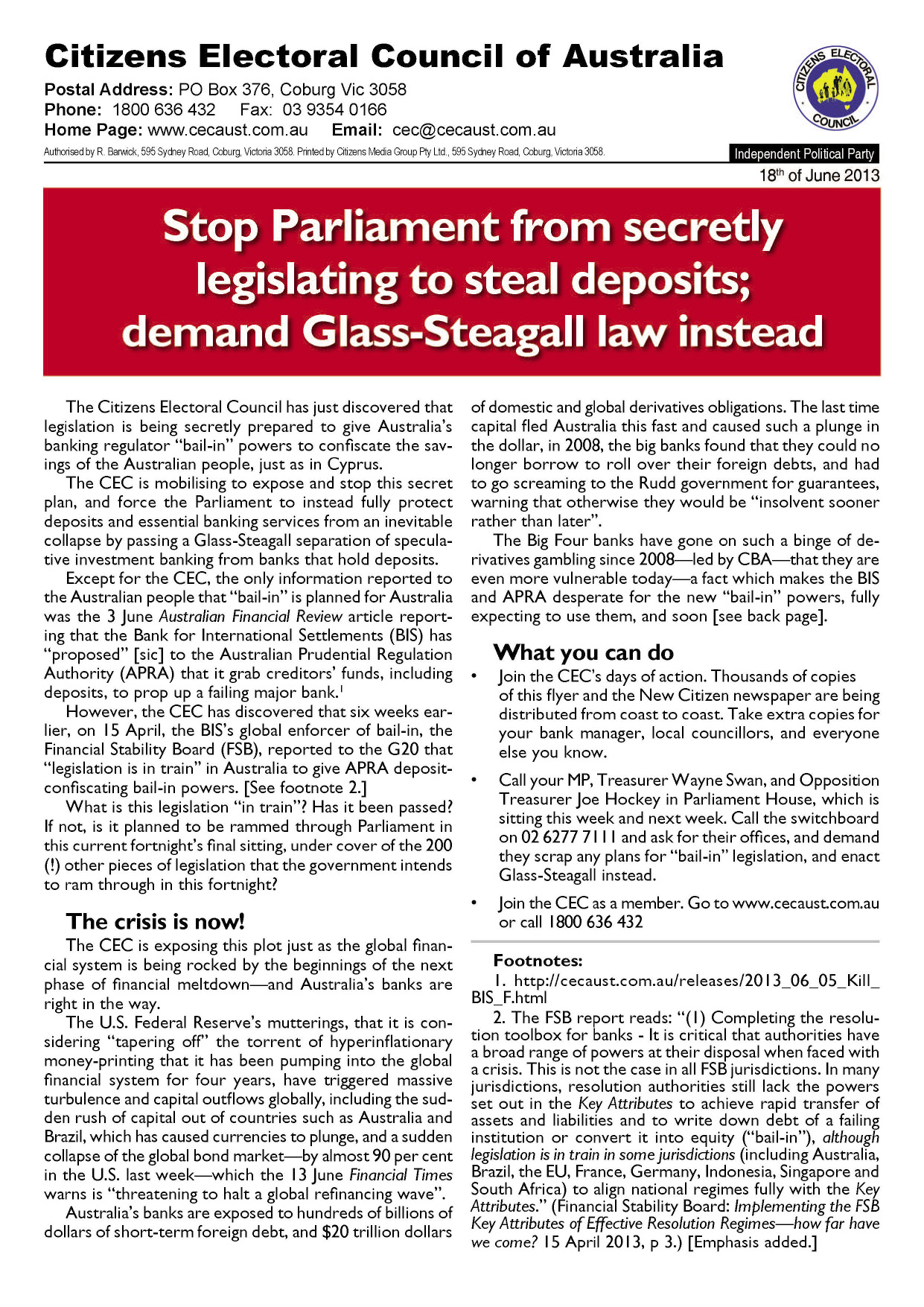 Typical of Australia’s subservience to British finance today, two Australians hold the #2 and #3 positions on the FSB Steering Committee. Right now they are trying to push bail-in powers through the Australian Parliament, which the CEC is presently blowing up in their faces.