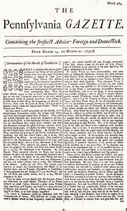 Franklin published an essay on the morals of Confucius in 1737 in his Pennsylvania Gazette. He published several chapters of Confucius’ moral philosophy in 1737. In a 1747 letter to George Whitefield, a very well-known pastor, Franklin wrote, “Confucius was my example. I followed Confucius.” Twelve years later, Franklin published Confucius’ works.