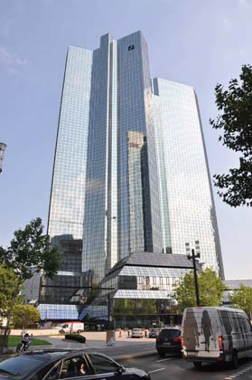 Over 90% of the monies the Euro system has “loaned” to Greece has flowed back to the derivatives-stuffed bankrupt European banks, like Deutsche Bank. Here, Deutsche Bank’s Frankfurt headquarters. |
