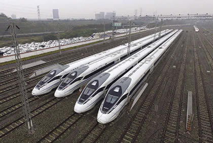 As part of China’s shift to knowledge intensive industries, it will continue to expand high-speed rail construction, said Premier Li Keqiang at the NPC, eventually linking 80% of China’s cities with high-speed rail. Here four CRH380D high-speed trains, which have a maximum speed of 380 km/hr. |