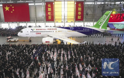The crucial role of science and technology was heavily emphasized at the NPC. The government will increase the budget for R&D. Here the C919, China’s first domestically produced large passenger aircraft at a plant near Shanghai. |