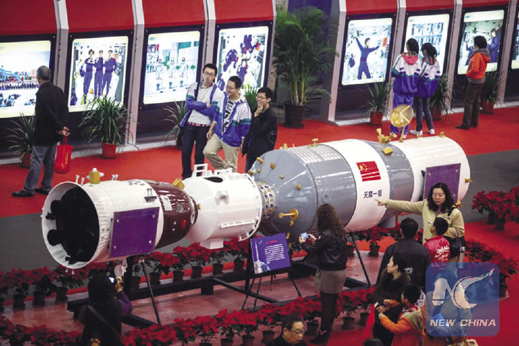 China’s Space Center has mapped out a 15-year space science strategy, as a contribution to humankind. Here a model of the Shenzhou-10 manned spacecraft docked with the Tiangong-1 space module, during a 2013 exhibit for the public. |