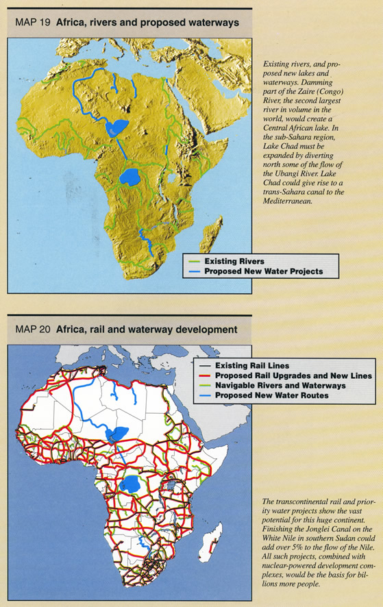 The plans exist for greening the desert, for expanding waterways, for building rail links and ports, for power, for new cities and agriculture regions. For example, in southern Sudan, over 150 kilometers of a big trench on the upper White Nile was dug (completing half of the proposed Jonglei Canal), and then had to be abandoned, because of IMF-era international opposition.