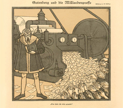 ![]() Gutenberg and the Billions-Press, “I never intended this!” From the German satirical magazine Simplicissimus, 1923. |