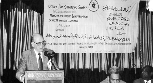 In January 2001, LaRouche travels to Khartoum, Sudan for a four-day conference sponsored by EIR and the Schiller Institute on "Peace Through Development: Nile Valley Development & The New Just World Economic Order." Lyndon LaRouche delivered the keynote address on "The New Bretton Woods System as Framework for a New Just World Economic Order" [PDF] in which he specifies three principles which must serve as the foundation for a new international economic system: