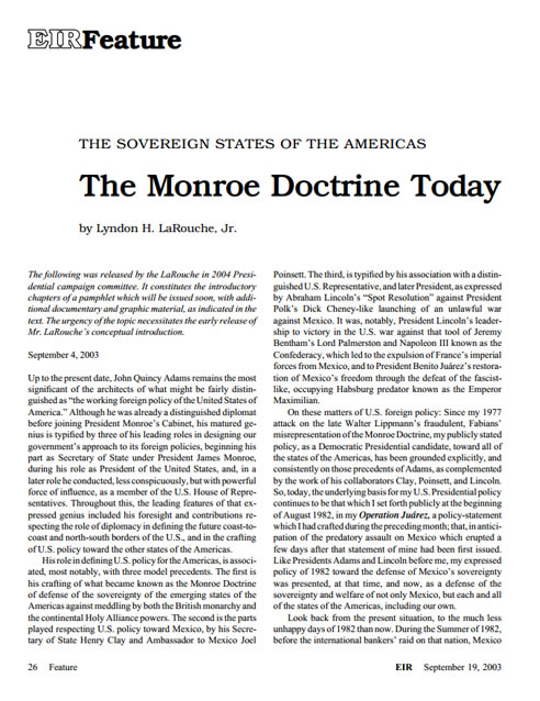 Lyndon LaRouche publishes a policy document titled "In The Footsteps of John Quincy Adams: My Strategy For The Americas" [PDF] reasserting the applicability of the Monroe Doctrine for the Western Hemisphere, and defining the neccesary anti-imperial community of principle among the nations of North and South America. In the conclusion of the document, LaRouche writes: