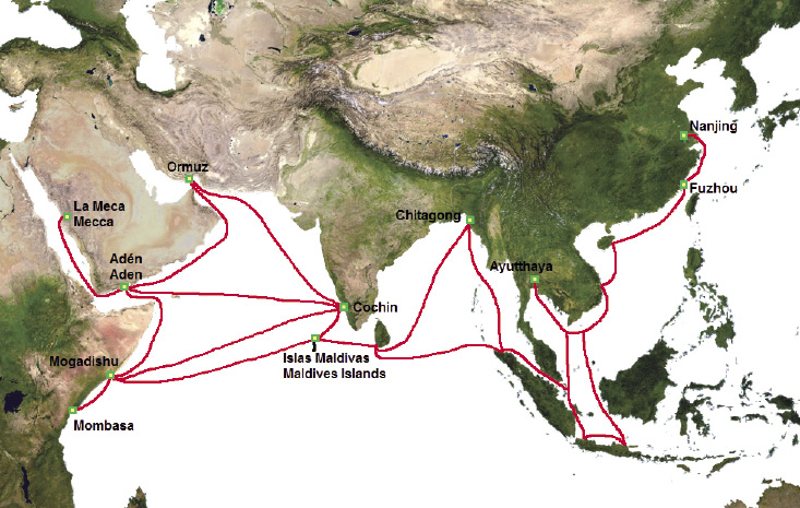 The ships sailed through the South China Sea, visiting the Philippines and the Indonesian islands; they went to Malacca and passed through the Malacca Strait into the Indian Ocean. They visited Thailand, Sri Lanka, and India. They went into the Persian Gulf and the Gulf of Aden, the Red Sea, and down the east coast of Africa as far as Madagascar and Mozambique, and perhaps all the way to the Cape of Good Hope. There were offshoots from these voyages that went to Mecca and to Egypt.