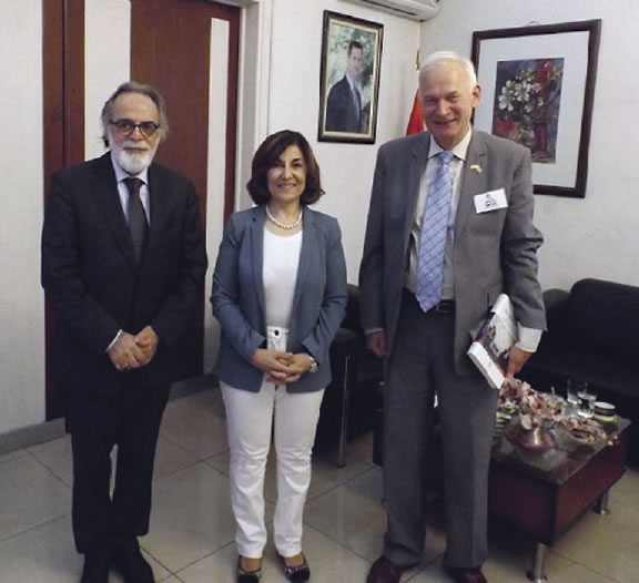 View full size![]() Dr. Inas al-Omawi (left), Director General of the Syrian Investment Agency (SIA) for foreign investors, with the author (right), Syrian representative of the Schiller Institute Mr. Talal Moualla, and delegation member Aly El Khosht. SIA is part of the Office of the Prime Minister and is located in the beautiful, old-style building where the prime minister formerly resided. |