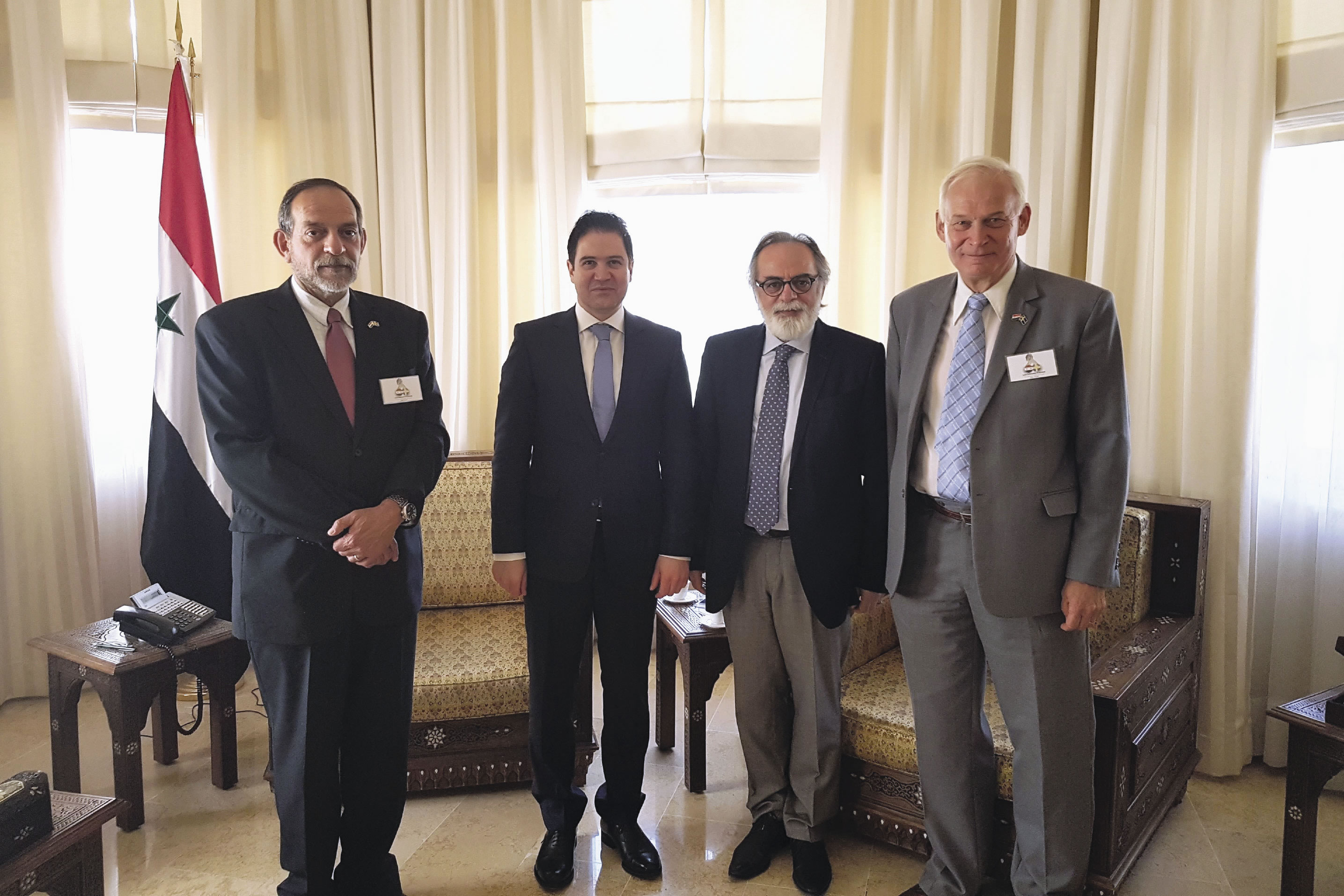 View full size![]() Syria Tourism Minister Eng. Besher Yazji (second from left) received the author (right), Syrian representative of the Schiller Institute Mr. Talal Moualla, and delegation member Aly El Khosht (far left). |