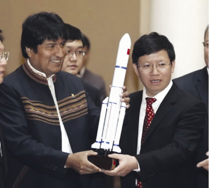 Bolivia’s President Evo Morales (L) and Wu Yanhua, a representative of the China Aerospace Science and Technology Corporation, hold a miniature model of the “Tupak Katari” communications satellite. |