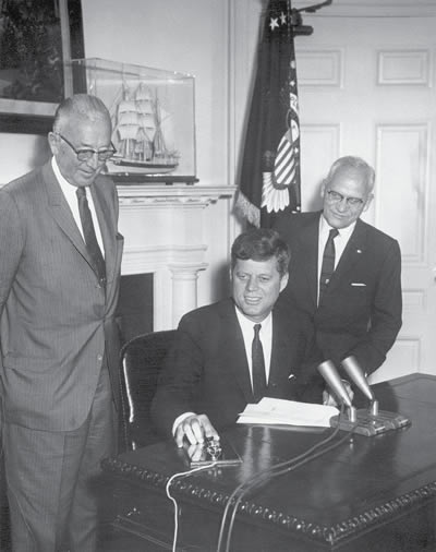 President Kennedy dedicates the first Saline Water Conversion Demonstration in Freeport, Tex. (with him are officials of Dow Chemical Co.). Kennedy is at the White House contacting the facility remotely—by telegraph, (or “on” switch?). |
