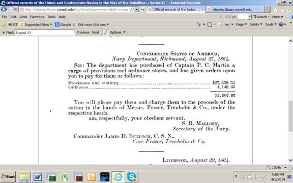SIR: . . . . on the 27th instant [September] I received through Messrs. Fraser, Trenholm & Co., your letter of the 27th ultimo [August], advising me of the purchase by the department of a cargo of provisions and ordnance stores from Captain P. C. Martin, with instructions to pay for them and how to charge the separate items. . . .