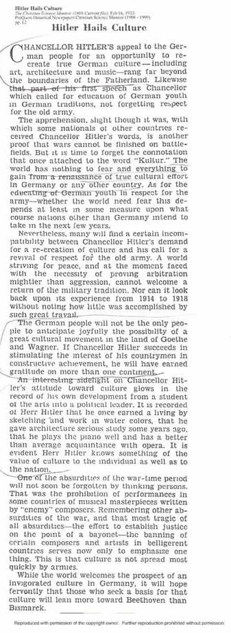 “An interesting sidelight on Chancellor Hitler’s attitude toward culture glows in the record of his own development from a student of the arts into a political leader. It is recorded of Herr Hitler that he once earned a living by sketching and work in water colors, that he gave architecture serious study some years ago, that he plays the piano well and has a better than average acquaintance with opera. It is evident Herr Hitler knows something of the value of culture to the individual as well as to the nation….”