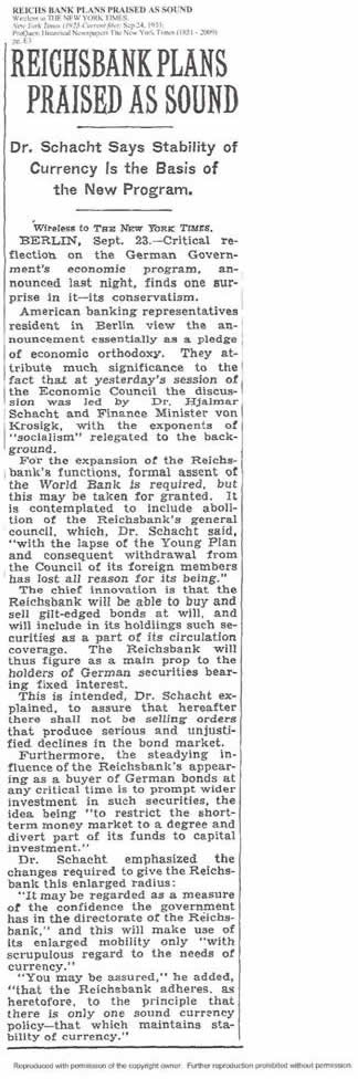 Under the September 24, 1933 headline, “Reichsbank Plans Praised as Sound; Dr. Schacht Says Stability of Currency is the Basis of the New Program,” the Times Berlin correspondent wrote,