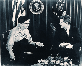 Kennedy came into the Presidency largely through the efforts of Eleanor Roosevelt. Under her influence, he adopted the intention of following the policies of Franklin Roosevelt. Shown: Eleanor Roosevelt with President Kennedy, at the White House, March 1, 1961, just weeks after he took office..