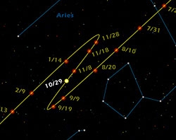 According to the National Aeronatics and Space Administration (NASA), Mars brightens and appears larger in diameter in the month of October, as it approaches its December 24, 2007 opposition (A great Christmas Delight!). June 2007 through April 2008 is the prime Mars observing period, although the Mars retrograde runs from October 1 to December 9, and should form an interesting curve. It is now possible to see some features on the planet through amateur telescopes. If you begin looking toward the East, approximately around 10:48pm EDT you will witness Mars rising above the horizon, in Gemini.This bright red warrior will appear higher in the sky than it was two years ago and will serve as a great mapping experiment for a star chart. For a simple experiment, you can choose a time to go out each night, (it could perhaps be in your backyard, although it is much more fun with groups of people) you can draw out the motion and changes that occur over time. Do this for the next four months and see what you get. What is shown below are the maps from NASAs website, of the previous years.
