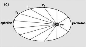 (c) Keplerss initial discovery of the equal areas, equal times principle was developed under the assumption that the orbit was circular, with the sun at an eccentric point. After comparing his results to the true observations, Kepler found he was 8′ of arc off. It is a tribute to Keplers genius, that he saw that this small discrepancy was a matter of principle, not simply a minor error. He subsequently revised all his work, and discovered that the planetary orbits were ellipses with the sun at one focus.
