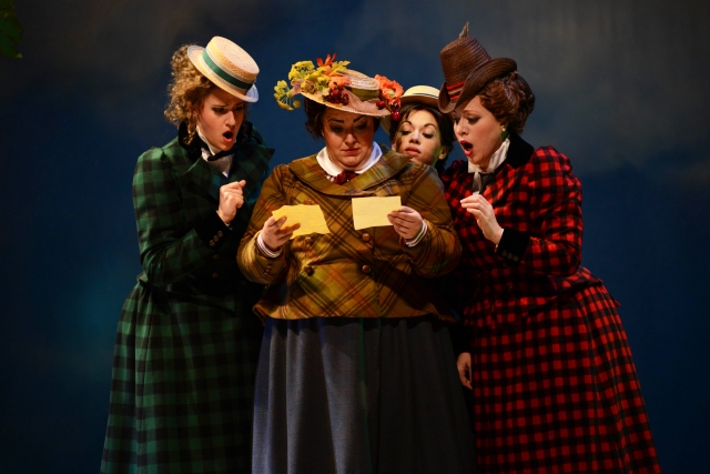 Left to Right: Coutney Miller (Meg Page), Ann McMahon Quintero (Mistress Quickly), Amanda Opuszynski (Nannetta), and Elizabeth Caballero (Alice Ford).