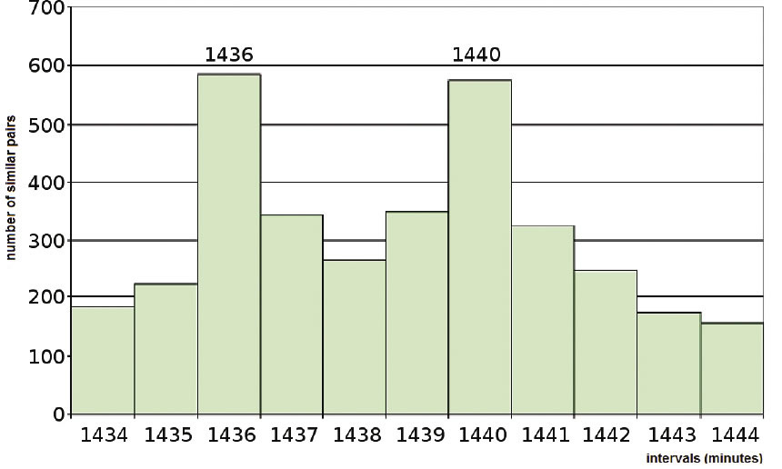 Shnoll refined his histogram intervals to minutes rather than hours, as shown in Figure 9, and compared them (he took one-second counts of decay, and made histograms of 60 different counts, amounting to one minute). When he did this, his 24-hour peak clearly separated into two peaks: one at 24 hours (1440 minutes) and one four minutes earlier (1436 minutes), exactly corresponding to the time it takes any particular place on Earth to come back to the same star (or seen inversely, for a star to come back to the same place in the sky).