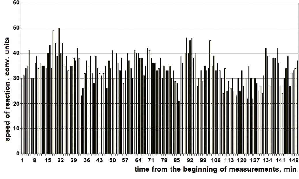This meant that either (1) a chemical reaction was influencing the enzyme reactions, but enzymes are just more sensitive to these changes, or (2) the chemical reaction was separately undergoing the same fluctuations of rates; that is, the histograms were the same shape, although the amplitude of variation in rates (Figure 1) is process dependent.