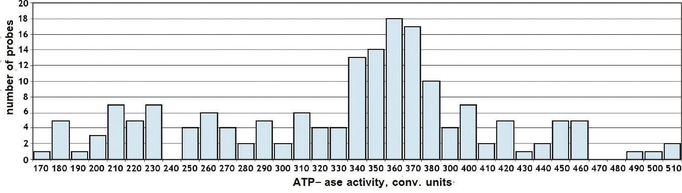 Figure 2 shows a bar graph (histogram) of these rates. It tabulates the number of times each reaction rate occurred. As can be seen in the graph, the reaction rate of 360 units of ATPase activity per unit of time occurred most frequently, while the rate of 240 units was never registered.