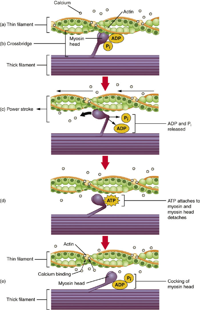 http://cnx.org/content/col11496/1.6/, June 19, 2013, unit 2-6-4. States of conformation in the actin myosin complex in skeletal muscle contraction. ADP is adenosine diphosphate; Pi is inorganic phosphate. |