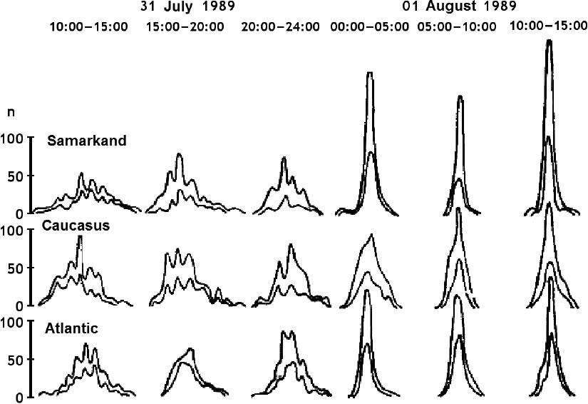 By placing radioactivity and chemical experiments on a ship traveling to the Indian Ocean, Shnoll’s team found that histograms recorded at Pushchino and near Madagascar—6000 miles away but at nearly the same longitude—were synchronized. Results from radioactivity measurements in Lindau, Germany, however, showed histograms that were similar those at Pushchino, but offset by one hour, exactly corresponding to the difference in longitude between the two places. There seemed to some dependence on local time.