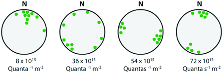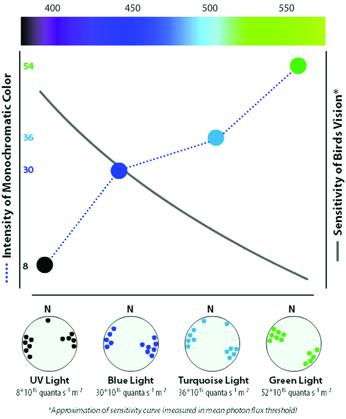 FIGURE 9 ![]() Direction of birds at successively higher levels of intensity of green light. Image adapted from Roswitha Wiltschko et al. (2010), op. cit. |