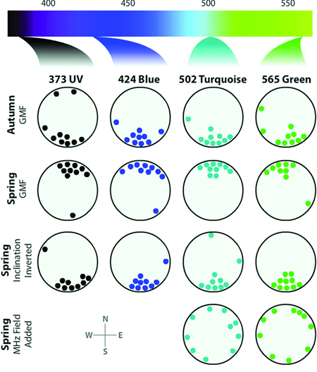This indicates that the light-dependent magnetoreception is only activated by the UV to green part of the spectrum, and fails to operate properly in the yellow to red range. As we saw above, this light-dependent response is related to the inclination compass, where the birds use the inclination of the magnetic field to determine direction (e.g., if the inclination of the field is inverted, the birds will go in the opposite direction, even though the directions of the north and south components of the magnetic field remain the same). Also, recall that this light-dependent magnetoreception is disrupted by a very low-intensity oscillating magnetic field of the proper frequency. These characteristics were tested, and demonstrated for monochromatic UV, blue, turquoise, and green light tests (Figure 7).