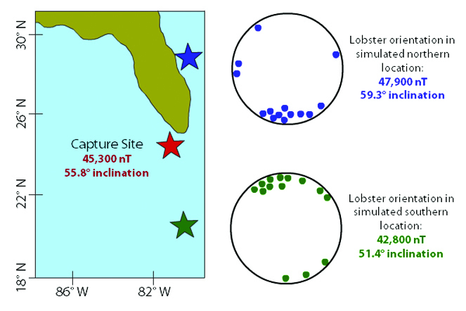 To test the ability for animals to utilize these components to determine their position, numerous experiments were set up, including with lobsters. Captured off the tip of Florida, their home location has a specific GMF intensity, inclination, and polarity. They were kept in one location, but two groups were tested in two different magnetic environments generated to simulate the GMF at two different locations. One group was exposed to magnetic conditions which simulated a location directly north of their home, while the other group was exposed to a simulation of the magnetic conditions of a specific location directly south. No other stimuli were provided to simulate any difference in location. In the first group, the lobsters predominantly attempted to head south, which would be the direction of their home, if they were actually at the location indicated by the simulated magnetic conditions. Likewise the second group, exposed to magnetic conditions simulating a location south of their home, attempted to head north, even though they were geographically in the same location as the first group. In both cases, the synthetic magnetic indicators appeared to be enough to trick the lobster into “thinking” they were at the location that would be associated with those magnetic conditions (Figure 3).