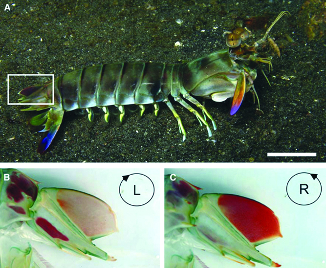 Mantis shrimp tail seen through left and right circularly polarized filters. |