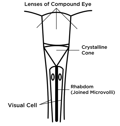 This midband is where most of the action occurs, being composed of many ommatidia, or “simple eyes,” each of which has long visual cells called rhabdoms, arranged and close-packed in a star pattern, pressing up against the ommatidia, similar to the insect eye. Here also, as in the cephalopods, we have tube-like microvilli, the light-sensitive part of the rhabdom, each of which points radially towards the center of the ommatidia, and which contains the pigment. Interestingly, more detailed studies reveal that the “small four lobed UV sensitive photoreceptor,” R-8, in the midband, is also said to be the one responsible for the circular polarization perception—two super-senses in one! “Circular polarization sensitivity is not innate to the R1-7 cells, but arises from the quarter-wave retardance of the overlying four-lobed R-8 cell.”[15] In some fish, and in bees and other insects, UV perception and polarization sensitivity are related, but only for linearly polarized light.