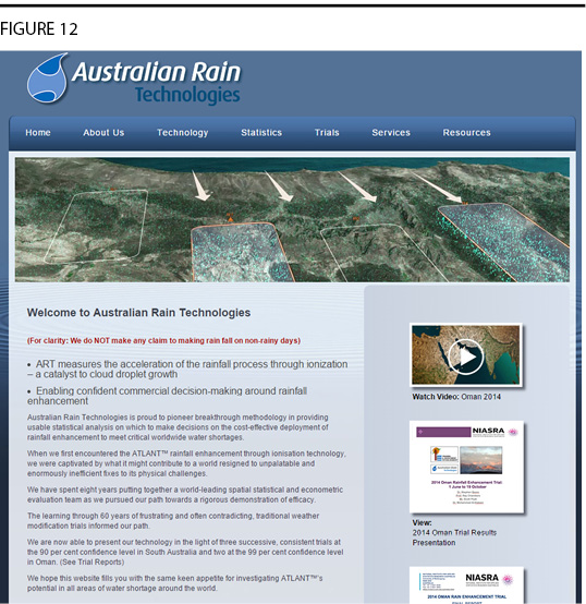 Now I want to highlight another company, separate from the company I just discussed, called Meteo Systems (Figure 11). This company was formed in Switzerland. They did some initial trials, demonstrations of some basic technology, similar technology, in Switzerland in 2006. This was then brought to the Middle East, developed in the United Arab Emirates (UAE), utilized there to increase rainfall, provide certain beneficial effects there.9 And then also, there was a spinoff company in Australia, which came out of Meteo Systems, a new company called Australian Rain Technologies.10 And here’s their website (Figure 12).