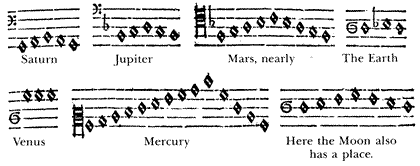Kepler’s discovery of universal gravitation, using principles of both visual and musical harmony, has nothing to do with the “Titius-Bode law.” Above: Geometrical model of the solar system as nested Platonic solids, from “Mysterium Cosmographicum.” Below: Harmonic relations of the planets expressed in musical notation, from “The Harmony of the World.” |