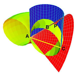Archytas developed a construction to find two geometric means between two magnitudes, AC and AB. Magnitude AC is drawn as the diameter of circle ABC; AB is a chord of the circle. Using this circle as the base, generate a cylinder. the circle is then rotated 90° about AC, so it is perpendicular to the plane of circle ABC; it is then rotated about point A, to form a torus with nil diameter. (The intersection of the torus and the cylinder produces a curve of double curvature.) Chord AB is extended until it intersects the perpendicular to AC at point D; this forms triangle ACD, which lies in plane of circle ABC, AB, and AC. Triangel ACD is then rotated around AC, producing a cone. The cone, torus, and cylinder, all intersect at point P. Perpendicular PM is then dropped from P along the surface of the cylinder, until it intersects circle ABC at point M; this forms right triangle AMP.