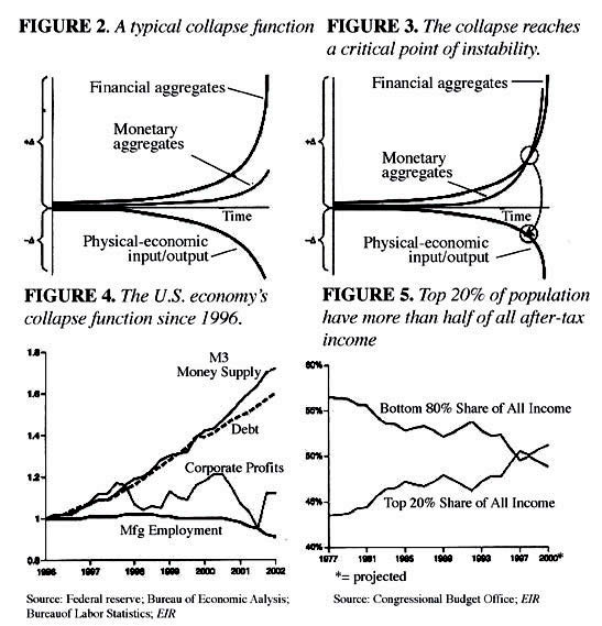 Over the 1966-2002 interval, the nominal values of U.S. financial and monetary growth zoomed, while the net physical values per capita collapsed. The financial crises of President Clinton’s tumultuous second term, 1997-2000, culminating in the collapse of the “Y2K/Infotech” and “hedge fund” financial bubbles, were essentially a culmination of a long process of degeneration of the U.S. economy’s physical basis, as reflected in the collapse of share of income of the lower 80% of family-income brackets.