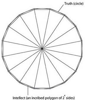 One of the most critical comments on Euclids Book III, Proposition 16 was made by Johannes Campanus, who edited Euclids Elements in the Thirteenth century. He inferred from III.16 that there was a flaw in the principle that the transition from the less to the greater, or vice versa, takes place through all intermediate quantities, and therefore through the equal. If a diameter of a circle, he says, be moved about its extremity until it takes the position of the tangent to that circle, then, as long as it cuts the circle, it makes an acute angle less than the angle of a semicircle; but the moment it ceases to cut, it makes a right angle greater than the same angle of a semicircle. The rectilineal angle is never, during the transition, equal to the angle of a semi-circle. There is therefore an apparent inconsistency with Book X, Proposition 1, and Campanus could only observe in explanation of the paradox, that these are not angles in the same sense, for the curved and the straight are not things of the same kind without qualification. There is every reason to believe that Cusanus had access to Campanuss edition of Euclid. Moreover, this is the same issue that Cusanus refers to in the passage in Book III, chapter I of On Learned Ignorance cited at the beginning of this article. Cusanus refers to this logical paradox as a certain singularity. In 1557, the French geometer Peletier, argued that the angle of contact was not an angle at all. He claimed that the contact of a straight line with a circle is not a quantity, and that angles contained by a diameter and a circumference are all right angles and equal to rectilineal right angles. For Peletier, there was no difficulty with Euclids Book X, Proposition 1, because all angles of contact are not-angles, not quantities, and therefore nothings. Vieta (1540-1603) agreed with Peletier that the angle of contact is no angle. His pseudo-proof was that the circle may be regarded as a plane figure with an infinite number of sides and angles; but a straight line touching a straight line, however short it may be, will coincide with the straight line and will not make an angle. In other words, if the circle is a straight line in the infinitely small, then there is no angle at the point of contact with the tangent. Not surprisingly, this was also the view of Galileo Galilei (1564-1642). This issue is in no way esoteric or academic; rather, it is one of the most profound issues confronting man. The cornicular angle is either equal to null, as the Aristotelians maintain, or it is virtually null, but nonetheless exists, and in fact has greater being and reality than the polygon which is derived from it. If the former is true, then the same argument can be made (and in fact has been made) theologically, that neither God nor the human soul exists. If the circle is no more than a polygon with an infinite number of sides, then God is equal to His creation (which is the basis of pantheism), and the soul is not immortal, but rather dies with the body. This is the same issue as that which later divided Gottfried Wilhelm Leibniz (1646-1716) and Leonhard Euler (1707-83). Leibniz insisted that monads, or simple substances, are indestructible and indivisible. Euler, on the other hand, had lyingly argued that all magnitude is divisible to infinity. To return to Nicolaus of Cusas argument: If one recognizes the existence of incidental angles, and understands that an incidental angle is not commensurable with a rectilinear angle, then it is clear that there can be no rational proportion between the area of a circle, and a rectilinearly enclosed area. As Cusanus writes: If a circle can be transformed into a square, then it necessarily follows, that its segments can be transformed into rectilinearly enclosed figures. And since the latter is impossible, the former, from which it was deduced, must also be impossible. Obviously, then, the semicircle cannot be transformed into a rectilinearly enclosed figure, and consequently also not the circle or one of its parts.Similarly, Cusanus writes in respect to contingent or cornicular angles that, although they cannot be divided by another straight line, they are nonetheless divisible by another curved line: The contingent angle is a divisible magnitude only in its species, since to every contingent angle there is a larger and a smaller contingent angle. Species DifferenceThrough this discussion of the incommensurability of incidental and contingent angles to rectilinear ones, Cusanus proves that the circle cannot be squared, because polygonal figures are not magnitudes of the same species as the circular figure: In respect to things which admit of a larger and smaller, one does not come to an absolute maximum in existence and potentiality. Namely, in comparison to the polygons, which admit of a larger and smaller, and thereby do not attain to the circles area, the area of a circle is the absolute maximum, just as numerals do not attain the power of comprehension of unity and multiplicities do not attain the power of the simple.What is significant about this statement is, that Cusanus has identified the fact that the circle is of a higher power, or cardinality, than the polygon. The circle is a true infinite. As such, it does not admit of greater or less, as does the polygon. The area of the circle is thus simultaneously maximal and minimal. Moreover, it is in actuality all that it is potentially. The circle transcends the polygon in the same way that unity transcends numerals, and the simple transcends multiplicities. The latter cannot attain to the former; nonetheless, the former are present in the latter, as the cause is present in its effect. Cusanus goes on to say that some consider the square equal to the circle, if it is not larger or smaller than the circle by the smallest specifiable fraction of the square or the circle: If one apprehends the concept of equality in this way, then it is justly said that one can give an equal c