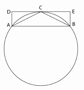 The same method is now used in respect to a polygon circumscribed around a circle [See Figure 4]. Suppose a square ABCD described about a circle. Make an octagon described about the circle by drawing tangents at the points E, etc., where OA, etc., meet the circle. Then the tangent at E cuts off more than half of the area between AK, AH, and the arc HEK. Thus, the octagon takes from the square more than half the space between the square and the circle. If continued enough times, the construction of successive regular polygons circumscribing the circle will leave sectors which are together less than any given area. (A sector is defined as the area outside of a circle cut off by two intersecting tangents [See Figure 4(a)].) Now let us return to Archimedes proposition. Archimedes says, let ABCD be the given circle, [See Figure 5] and K the triangle described [See Figure 5a]. Then, if the circle is not equal to K, it must be either greater or less. What Archimedes then does, is to prove that the circle cannot be either greater or less than K. First, he assumes that it is greater than K, and then, using the Eudoxian method of exhaustion, proves that it cannot possibly be greater. Then, assuming that it is less, he uses the same method to prove that it is impossible for it to be less. Then, since it is neither greater nor less than K, he concludes that it must be equal to it.