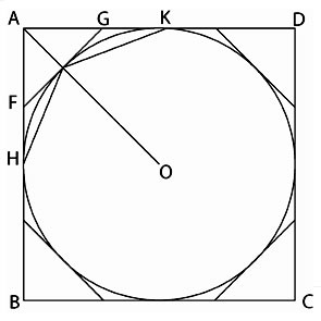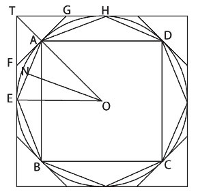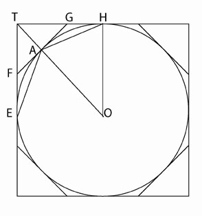 Let AE be any side of it, and ON the perpendicular on AE from the center O [See Figure 6]. Then, ON is less than the radius of the circle, and therefore less than one of the sides about the right angle in K. But, the perimeter of the polygon is less than the circumference of the circle, i.e., less than the other side about the right angle in K. Therefore, the area of the polygon is less than K; which is inconsistent with the hypothesis. In the case where the circle is less than K, Archimedes directs: Circumscribe a square, and let two adjacent sides, touching the circle in E and H, meet in T [See Figure 7]. Bisect the arcs between adjacent points of contact and draw the tangents at the points of bisection. Let A be the middle point of the arc EH, and FAG the tangent at A. Then the angle TAG is a right angle. Therefore TG is greater than GA and greater than GH.