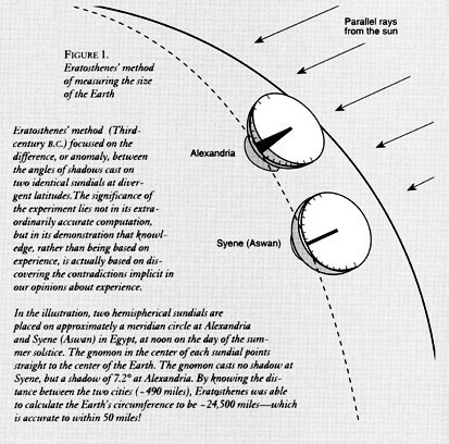 How The Human Mind Actually Functions: Higher Hypothesis Imagine that you are the most celebrated fellow-scientist among Archimedes' contemporaries and colleagues, the mathematician Eratosthenes, from Plato's Academy at Athens. Eratosthenes was, during the time of his correspondence with Archimedes, the leading scientific mind of Egypt. Among Eratosthenes' numerous other revolutionary discoveries of universal principle, he conducted an experiment which not only proved that the Earth was approximately sphericalnot flat, but also gave him a remarkably good estimate for the size of the Earth.9 In fact, this discovery in the field of geodesy, during the Third century BCE , made possible the construction, about seventeen centuries later, of the world map drawn by Nicolaus of Cusa's associate Paolo Toscanelli. The latter was the same map which Columbus used to plan his first, 1492, voyage of discovery to the Caribbean.10 The specific importance of that discovery by Eratosthenes, for our purposes here, is that it contains within it the germ of the essential principles common to all valid fundamental, experimental discoveries of universal physical principles. That is the principle, as developed by Carl F. Gauss, upon which Riemann based his revolution in physics; we reference that experiment here to illustrate Riemann's principle. Is the Earth flat? That is to say, if a plumb-bob on a string points downward, could we construct, at a level below any part of the Earth's water-level surface, a plane which would always intersect, at right angles, all of the lines extended from all plumb-bobs? If so, then, we could also construct a plane just sufficiently above any local region of the Earth's ground/water surface, that it would always be at approximately right angles with all plumb-bob lines, and yet never more than merely touch the surface of earth or waters, tangentially, in that locality. Choose a region along the Nile from Aswan to Alexandria. Select the direction of this line to correspond to an astrophysically-determined south-north direction. Define noon, as the instant the shadow cast a by an upright pin (as aligned by a plumb-bob) lies along that south-north line. Now, as the sun appears to move from east to west, consider the area swept by the shadow of the pin upon a surface which always lies at a right angle to the plumb-bob lines. This shadow will define the relevant sector of a circle. The plane of that sector, then, defines the supposed flat Earth. Measure the distance from Aswan to Alexandria along the south-north line.