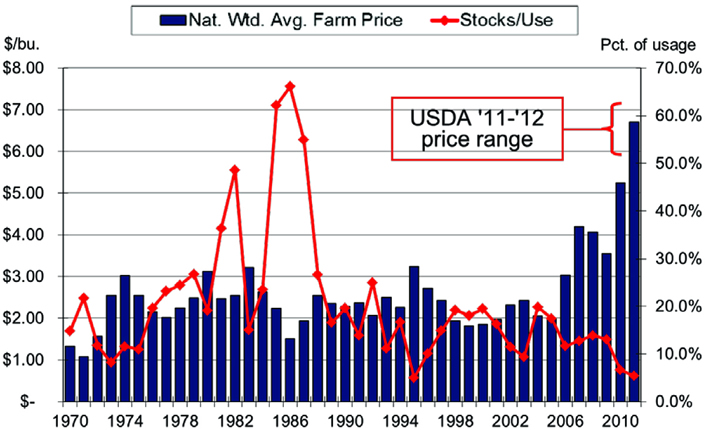 | FIGURE 1 U.S. Corn Price & Stocks/Use Ratio 1970-2010 ![]() |